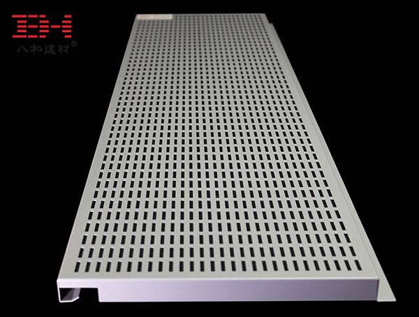 奧迪汽車4S店展廳室內天花吊頂,選用八和建材定制的規格尺寸為600*1200mm,厚度1.2mm,表面處理靜電噴涂,沖4*21mm長方形孔的勾搭式鋁天花板吊頂。當今市場上常用的沖孔鋁天花吊頂多為圓形1.0、1.8、2.3mm直徑的孔,達不到汽車展廳要的效果。這種奧迪汽車4S店展廳長方形孔勾搭式鋁天花板吊頂效果更獨特,在背面覆以一層吸音無紡布,能達到一定的吸音效果,同時,還能起到一定的隔塵作用。