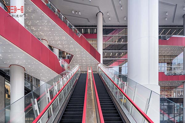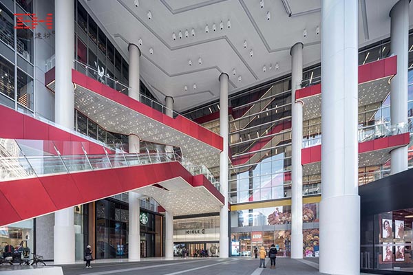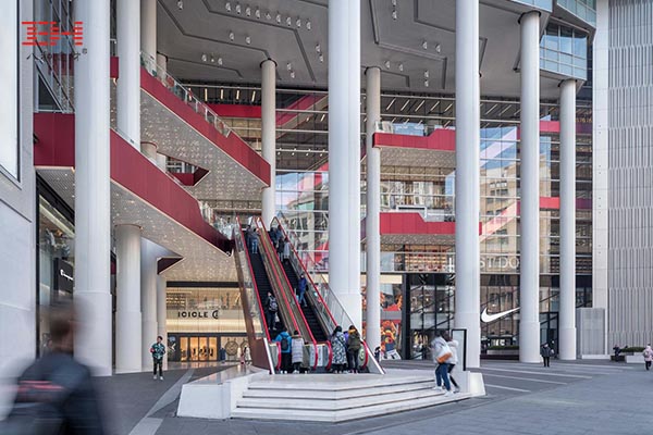 包柱鋁單板裝飾的巨型柱群支撐起的門面兼大廳,代替了門口的功能,直接把扶手電梯和露臺設置在門口巨型立柱上,既美觀又兼職功能性,增強建筑與街道的交互感。