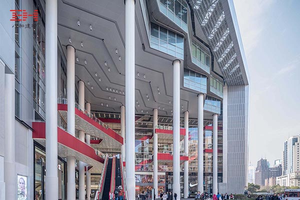 上海世茂廣場是上海現代地標之一,2018年翻新后重新開放,翻新后的世茂廣場大門立面是標志性的劇院式露臺結構樣式,核心是由包柱鋁單板裝飾的巨型立柱群,氣勢恢宏。