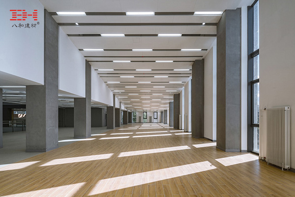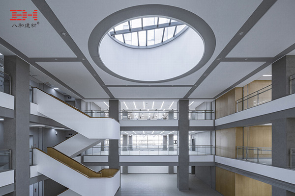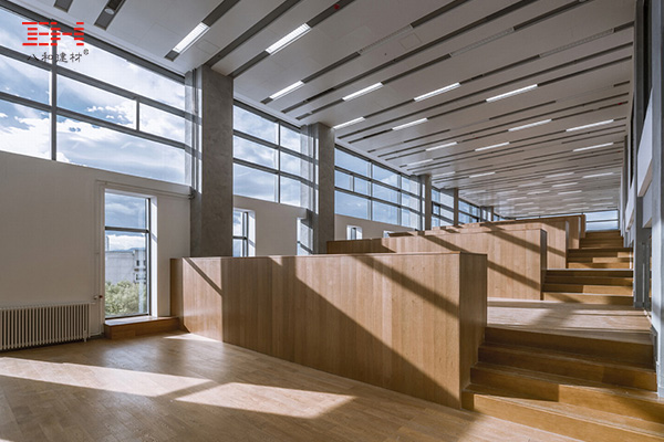 鋁單板天花吊頂裝飾符合開放空間的開敞通風特性,加上一系列的寬大坡道,階梯式座位區以及落地大窗,創造舒緩、平靜的閱讀環境,營造高大、氣勢磅礴的場館形象。光潔的鋁單板吊頂、明亮的自然采光,創造了一個可高效利用的空間,讓師生在其中自由無拘、連續穿行。