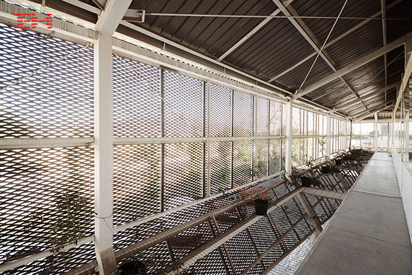 考慮到該地區氣候干燥,并且受到來自北部和西部的主要太陽輻射的照射,陽光控制極為重要。因此,20毫米間距金屬拉伸網蒙皮的目的是提供色調和允許辦公室體積的適當的通風。該表皮由鋼結構支撐,該鋼結構使刻面的外觀更具造型感。