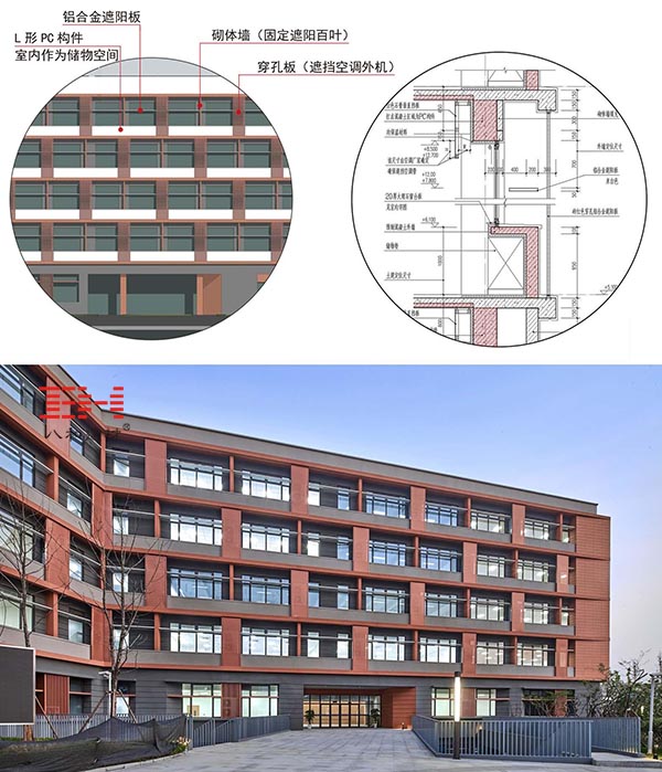 遮陽鋁板、穿孔鋁板、鋁百葉與石材涂料組成的學校幕墻