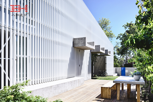 Moving House 是一棟于維多利亞州基尤區(qū)(Kew,Victoria)的住宅。 房子外部的白色鋁制屏風(fēng)形成了一個(gè)輪廓如同郊區(qū)山墻屋頂般的單一體量,形體和顏色與它近鄰的景觀(guān)相融,在保持透光性的基礎(chǔ)上巧妙地分割了室內(nèi)外空間。