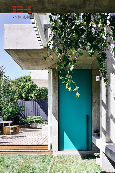 外部的屏風(fēng)在片刻間暫停了訪(fǎng)客來(lái)到這棟房子的初始體驗(yàn),穿過(guò)外立面走向入口時(shí), 屏風(fēng)進(jìn)行了解構(gòu)以揭示房子本身的混凝土結(jié)構(gòu), 而一趟充滿(mǎn)發(fā)現(xiàn)與驚喜的旅程就此展開(kāi)。進(jìn)入空間的序曲在一個(gè)凹陷空間中完結(jié),混凝土梁一根一根懸挑出來(lái),提供著局部遮蔭和庇護(hù),植物從溝槽懸掛下來(lái),而地上鋪滿(mǎn)了 草坪,這是在那柯布西耶式的綠色門(mén)與其造工精細(xì)的木門(mén)把手前面的一片世外桃源。