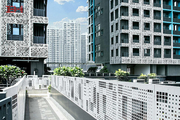 方孔鋁單板不同的洞口變化韻律使堅硬冰冷的建筑附上了一層溫柔與綠意。方孔穿孔鋁單板讓堅硬冰冷的建筑立面似乎活躍了起來,為城市帶來了新的生活與空間。年輕、律動、時尚,佛山兆陽O³大廈像一面充滿綠意的二維碼佇立在禪城區(qū),成為一個充滿青春活力的新型城市坐標。讓人們可以享受簡單、時尚、自由、綠色的生活方式。