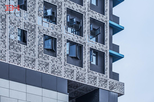 兆陽O³大廈位于禪城區(qū)朝安路與同濟東路交匯處,立面設(shè)計上以樹影為靈感,設(shè)計以自然二維碼為主題的建筑立面。方孔鋁單板給建筑附上一層通透的表皮使之起到環(huán)保、生態(tài)、遮陽的效果。