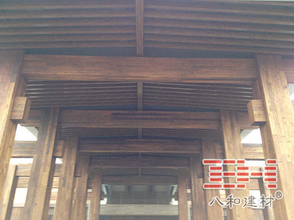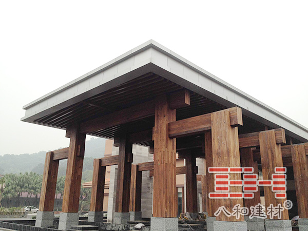 走廊和亭柱采用了八和建材的木紋鋁單板,氟碳漆鋁單板和木紋鋁方通,整體與周圍環境綠色環保名勝風格形成一致。