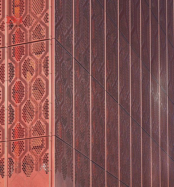 - 銅色穿孔鋁板外墻,極具金屬感的廣州得意日式鐵板料理餐廳