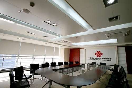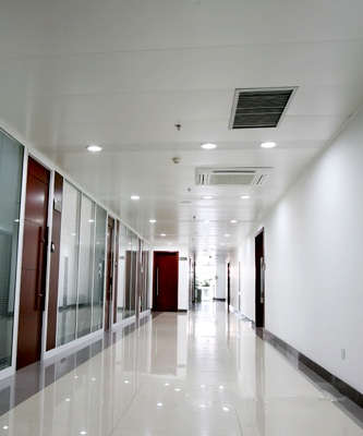 天津聯通大廈室內天花吊頂采用的是2.0mm厚的鋁單板天花吊頂,天花白色聚酯漆表面噴涂,能夠讓表面不易沾污跡,易清潔。白色的表面讓光折射擴散,讓大堂更加明亮。