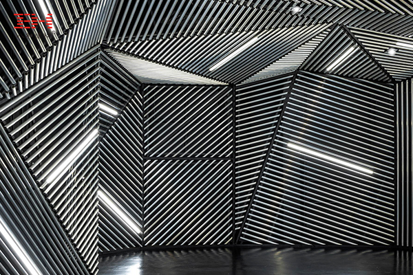 新加坡RACE機器人實驗室整個室內墻面和天花均由O型鋁圓管裝飾,O型鋁圓管斜向排列成一個個平面,平面之間按不同角度放置,間插條形燈管,鋁管貫穿整個室內,整個空間充滿著未來感。