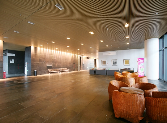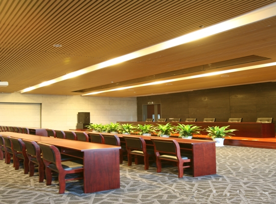 西安美術館室內裝修天花吊頂使用的是仿木紋鋁方通,鋁方通厚度1.5mm,最長6米一根,兩根之間通過連接件連接,從而讓整個天花看起來線條更加整齊,富有層次感。也讓該博物館成為標志性建筑物。