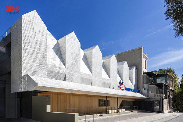 Thanopoulos超市坐落于雅典市的北郊,該建筑外墻面采用了連排尖頂小屋的造型并使用了有仿梧桐樹(shù)樹(shù)葉形狀的藝術(shù)外墻鏤空鋁單板,通過(guò)這種充滿熱情和吸引力的設(shè)計(jì),使墻面變得鮮活生動(dòng)。