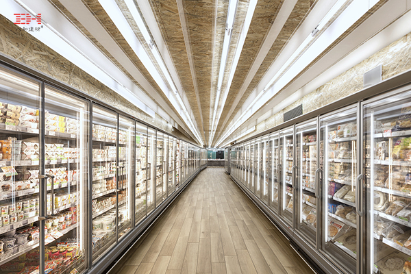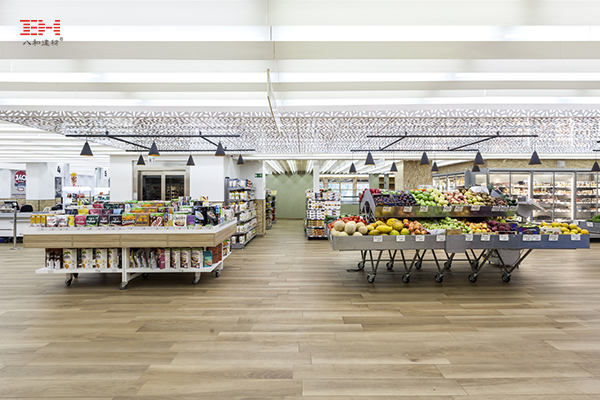 室內(nèi)采用用垂直有機(jī)玻璃線作為傳導(dǎo)光材T5熒光燈照明的代替吊頂照明結(jié)構(gòu),使定向刨花板為背景的天花板能夠發(fā)出均勻的熒光。在樓層天花板的中央,一塊預(yù)制的穿孔結(jié)構(gòu)鋁制天花吊頂懸掛在時(shí)令商品和農(nóng)產(chǎn)品銷(xiāo)售區(qū)的上方,為該區(qū)域增添了活力。