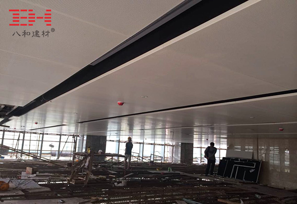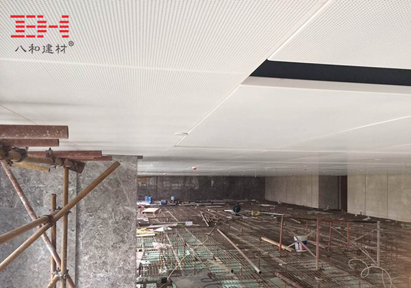 這次中山保利一期項目選用的是八和建材2.0mm厚的沖孔鋁單板吊頂天花,白色的表面,背面加了黑色的吸音棉。沖孔鋁單板天花較之普通的鋁扣板吊頂天花,在規格尺寸上在更多的選擇,如鋁扣板吊頂常規最大尺寸為600*1200mm,如果安裝在室內空間比較大的地方,會顯得不夠大氣。這次中山保利一期項目用了大規格的沖孔鋁單板吊頂天花,需要在背面組裝加強筋,而且安裝結構上要比普通的鋁扣板吊頂更穩定,平整度更高。