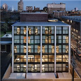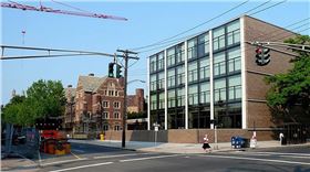 當漫步于校園旁的街道,這座建筑干凈質樸的墻壁屹立于此,與校園的新哥特式建筑背景相映成趣。