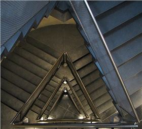 中央的樓梯體現了三角形的模式,使用的是鋁拉網護板,并外部的線條也充當了美術館空間中央的雕塑。