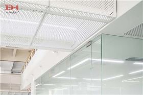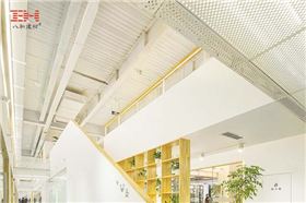 項目內部大量運用了沖孔鋁單板進行裝飾:白色的沖孔鋁單板被運用在天花、墻面,也被改造成護欄,沖孔鋁單板作為裝飾建材既有較高的硬度與強度的也使建筑空間具有通透性。