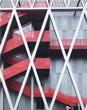 FUTURE STITCH針永體育全新智慧工廠位于浙江海寧經濟開發區,工廠采用外掛樓梯發設置,樓梯及樓梯走廊采用高透的穿孔鋁單板作為護欄。外掛樓梯使得內部空間的再劃分變得更加自由。