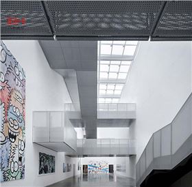 工廠內部也設置了大量樓梯,同樣適用穿孔鋁單板進行裝飾。樓梯三面覆蓋穿孔鋁板,與墻面天花的金屬拉伸網呼應搭配,充滿藝術感,在設計師的理念里,工廠也是美術館。員工在工作之外能夠享有更多的公共交往空間,廠房充滿體驗性、歸屬感和自豪感。