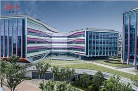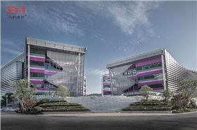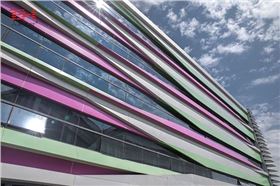 斜向彩色鋁單板作為遮陽(yáng)板,與條形玻璃幕墻組合,構(gòu)造出大量靈動(dòng)流暢的線條,為小鎮(zhèn)增添了活躍的流動(dòng)色彩,體現(xiàn)小鎮(zhèn)主題設(shè)計(jì)和功能特色。