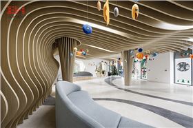 越南生態兒童幼兒園旨在為兒童提供鼓勵好奇心、基于活動的學習和與自然互動的空間。幼兒園內部天花多處采用鋁方通吊頂、弧形鋁方通,基于自然及其結構幾何的設計語言,激發孩子對有趣世界的探索。