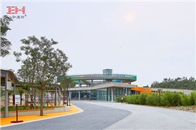 低碳生活館與周圍配備建筑整體以綠色和仿木色為基調(diào)。生活館東側(cè)為竹林劇場,以木材為主要裝飾,生活館四周被草坡和樹木環(huán)繞。在此基礎(chǔ)之上,木紋U型鋁方通在主場館內(nèi)外天花的大量使用,使整個(gè)園區(qū)渾然一體,主題突出。