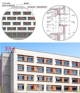 復(fù)旦大學(xué)新江灣第二附屬學(xué)校立面結(jié)構(gòu)為預(yù)制混凝土體系(PC),重復(fù)的構(gòu)件便于實(shí)現(xiàn)裝配。立面有三種形式與結(jié)構(gòu)相結(jié)合:2個(gè)主立面采用水平遮陽(yáng)構(gòu)件,保證采光均勻;東立面是鋸齒狀的,可遮陽(yáng)和采光。立面材料為低價(jià)的石材涂料,局部點(diǎn)綴鋁板幕墻,搭配“灰、紅”色調(diào)。整體效果韻律感強(qiáng),活潑精致,體現(xiàn)了裝配式而不呆板的特點(diǎn),符合中小學(xué)建筑的特點(diǎn)。這是學(xué)校項(xiàng)目在預(yù)制混凝土結(jié)構(gòu)體系發(fā)展方向的嘗試。