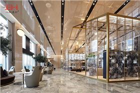 巨大而通透的房子形狀的裝置構(gòu)架很好的減弱了層高過(guò)高帶來(lái)的空曠感。沖孔鋁單板的透明的立面架構(gòu)是“圍”與“透”的結(jié)合,打破了原有的景觀結(jié)界,使整個(gè)空間被完美通透的呈現(xiàn)。