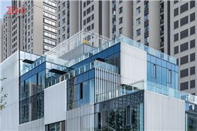 立方長廊的外立面采用了玻璃幕墻加白色鋁方管格柵的雙表皮構造,一方面為不同業態如餐飲、娛樂等后勤空間提供遮擋,也使室內的自然采光得到充分保證。另一方面整個商業外部視覺既具整體性又富有變化,最大限度的發揮了沿街展示面的昭示性,為垂直密集的社區和主干道之間提供了視線和空間的緩沖。