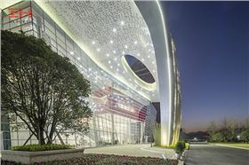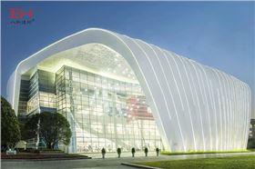 重慶房地場職業(yè)學(xué)院圖書館正立面是個瀑布狀的平行四邊形鋁板結(jié)構(gòu),通過平面角度的變化,形成鋸齒狀的平面效果,在陽光照耀下,有著豐富的光影變化。