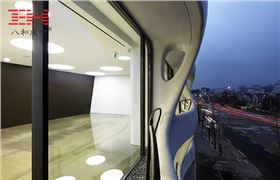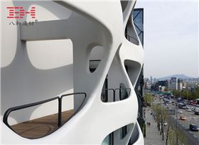 韓國首爾漢南洞HANDS公司總部作為這地段一個體量不算大的建筑,該項目要求具有一定的標志性。而建筑立面,作為城市的風景組成之一,不允許行人或汽車之間形成視線交流。而該項目則是打破這一陳規,讓環境(行人、居民)與建筑之間形成自然的視線交流,加強該建筑在城市風景中的作用。曲線的形式也增加了停留者對空間產生的趣味性,看似混亂的波浪面,實則相同顏色的面具有著相同的曲率,為制造加工減少了一定的負擔。