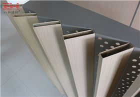 這次八和建材的新產品--曲面造型鋁單板與木紋方管鋁方通組合產品是為“廣州東塔”項目定制的,由帶有曲面的造型沖孔鋁單板做底板,在前面有順序的組裝一條條仿木紋鋁方管而成。這種產品主要應用于室內背景墻的裝飾,產品整體裝飾效果高低起伏,仿木紋鋁方管組成的線條圖案不規則卻不顯得亂,整個設計也是高端大氣中帶有個性。