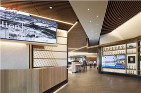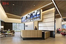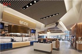 希爾頓總部的餐廳是一個休閑的社交場所,正如大多數(shù)購物商場頂樓的餐飲區(qū)一樣,采用了主流的木紋型材鋁方通天花吊頂裝飾。同時,木紋的自然材質(zhì)結(jié)合現(xiàn)代裝飾風格,正是希爾頓的品牌特征,木紋鋁方通的裝飾亦常見于其旗下遍布全球的星級酒店。