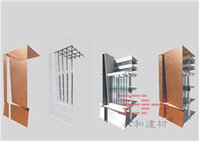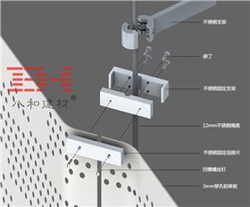 優質的鋁板板材如果尺寸和工程設計合理,并不需要加強筋強化面板,而建筑師在設計的時候,充分集合當地的氣候條件和力學設計原理,使用了外掛式的安裝方法,如下圖所示。