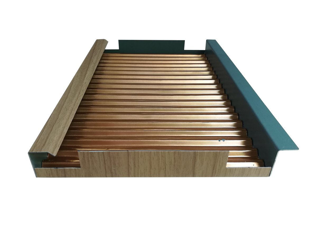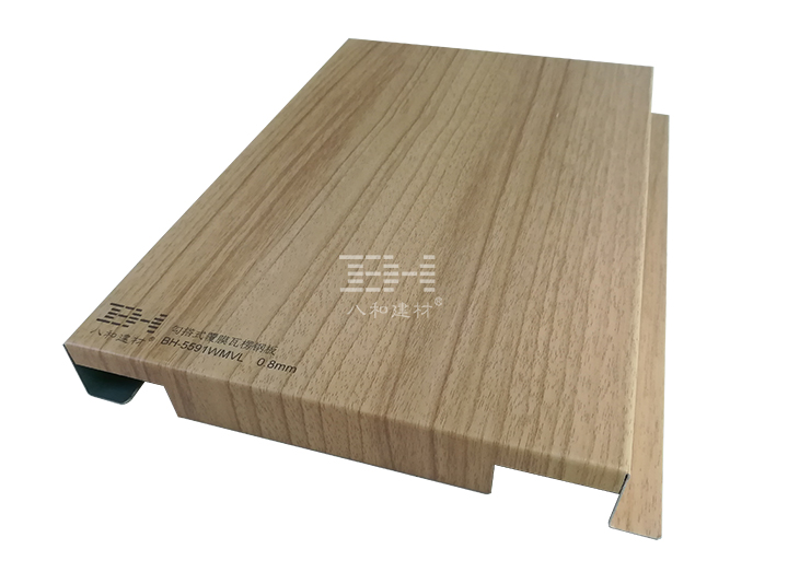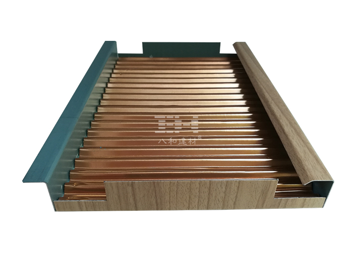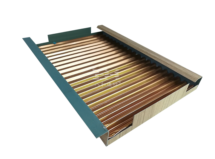 勾搭式覆膜鋼瓦楞板就是覆膜鋼瓦楞板做成勾搭式的結構,運用于天花裝飾中。相較于傳統鋁瓦楞板,其具備覆膜鋼板的諸多優點,如:強度高,不易變形,A2/B1級防火,抗刮,防潮,環保無甲醛,紋路樣式多樣,經久耐用不變色等。