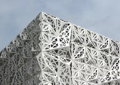 藝術鏤空鋁單板外墻是建筑鋁單板幕墻的一種藝術表現形式,在鋁單板上鏤空出各種各樣的藝術圖案,不僅裝飾效果好,而且可以體現不同建筑所代表的文化。